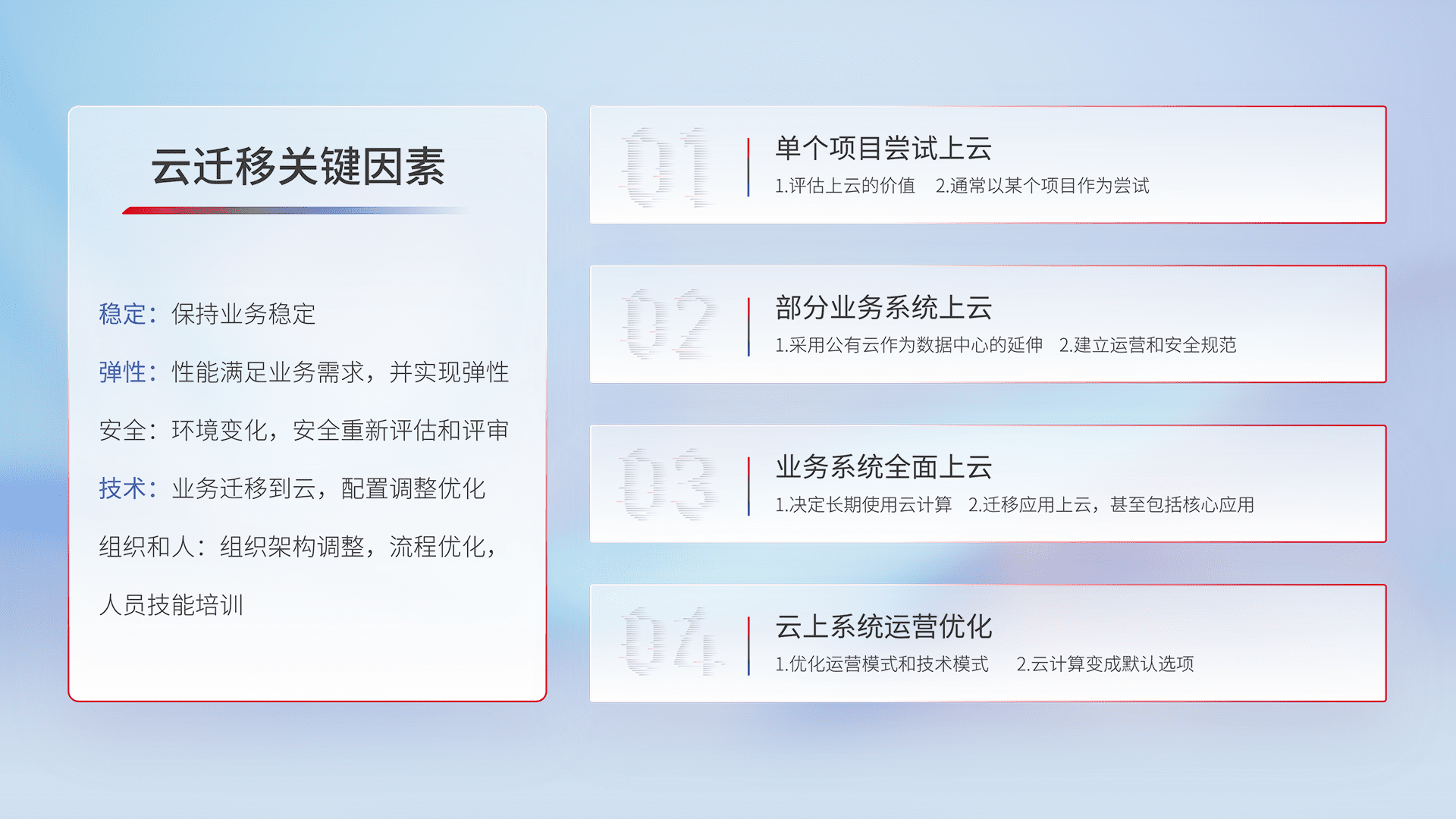 结合实际业务,,,从规划设计、、云平台选型、、、、云原生改造、、数据迁移、、、、集成交付,,,,迁移全过程为客户识别最佳上云路径,,做好风险识别管理,,,设计网络架构、、、身份权限、、、、安全审计合规、、操作审计、、、、日志审计、、监控告警策略、、、、多站点容灾设计等,,,,对云上基础设施进行整体规划,,提升IT治理水平,,以满足弹性、、、高可用、、、高性能的需求。。。。